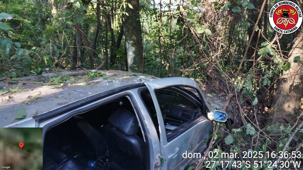 - Um homem de 35 anos, consciente e desorientado, preso no banco traseiro do veículo, com hematomas e dores. Ele foi resgatado pelos bombeiros com técnicas de resgate veicular e atendido pela equipe da ASU-551 do CBMSC.