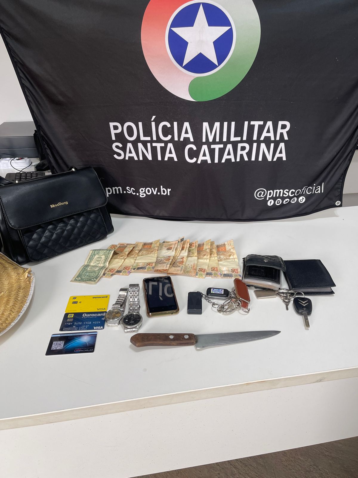 Com base nas informações repassadas, as guarnições localizaram o veículo utilizado pelos marginais, que foi reconhecido pelas vítimas. No interior do automóvel, os policiais encontraram o celular de uma das vítimas, além de uma faca de cozinha, utilizada no momento do crime, bem como outros objetos relacionados ao roubo.