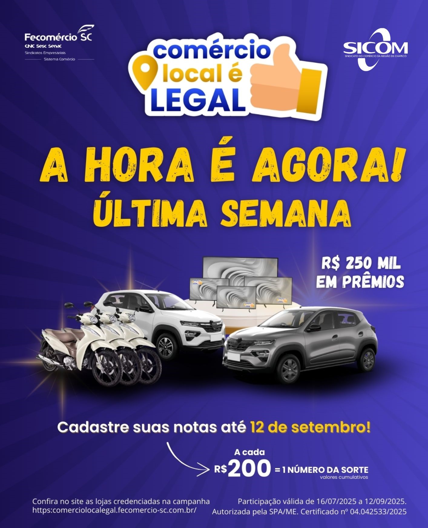 Os consumidores que estão comprando nos estabelecimentos participantes da ação de sorteios da campanha Comércio Local é Legal têm até esta sexta-feira, 12 de setembro, para cadastrar notas fiscais e concorrer aos prêmios oferecidos pela Federação do Comércio de Bens, Serviços e Turismo de Santa Catarina (Fecomércio/SC).