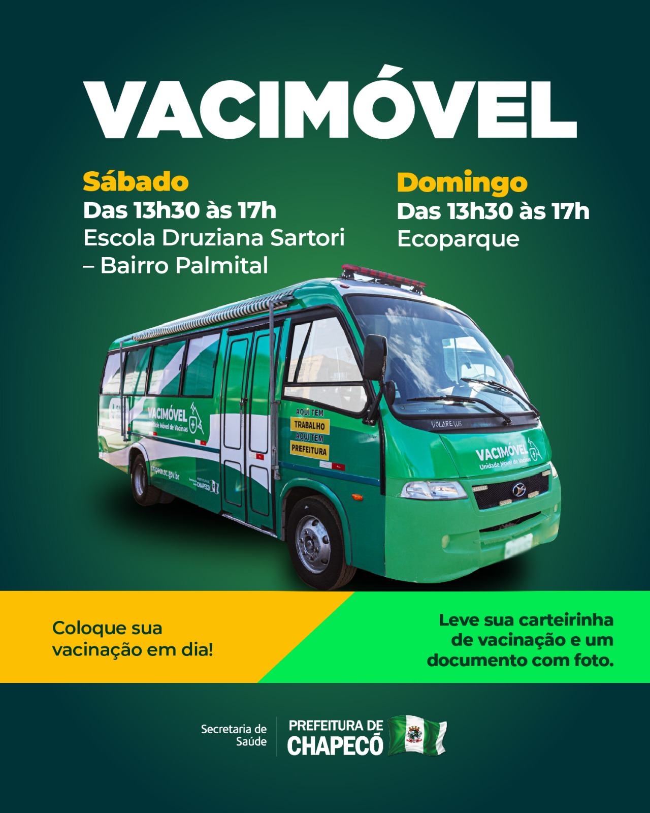 A Prefeitura de Chapecó informa que o Vacimóvel voltou, com nova roupagem, e estará atendendo no sábado, na Escola Druziana Sartori, no bairro Palmital, das 13h30 às 17h. No domingo o veículo e equipe estarão no Ecoparque, no mesmo horário.