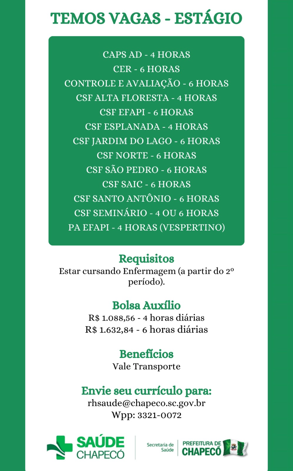 A Prefeitura de Chapecó informa que está com vagas disponíveis de estágio para atuação na área da saúde. Elas são para os serviços da Secretaria de Saúde.