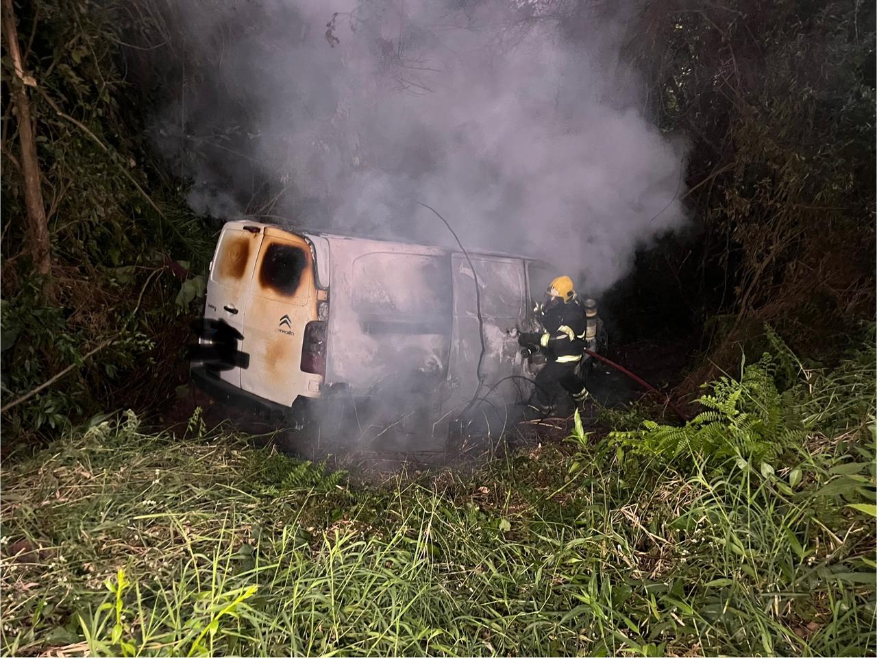 Ao chegar no local, os bombeiros encontraram um utilitário fora da pista, em um barranco, completamente tomado pelas chamas. De imediato, foi realizado o combate ao fogo e, na sequência, os trabalhos de rescaldo.