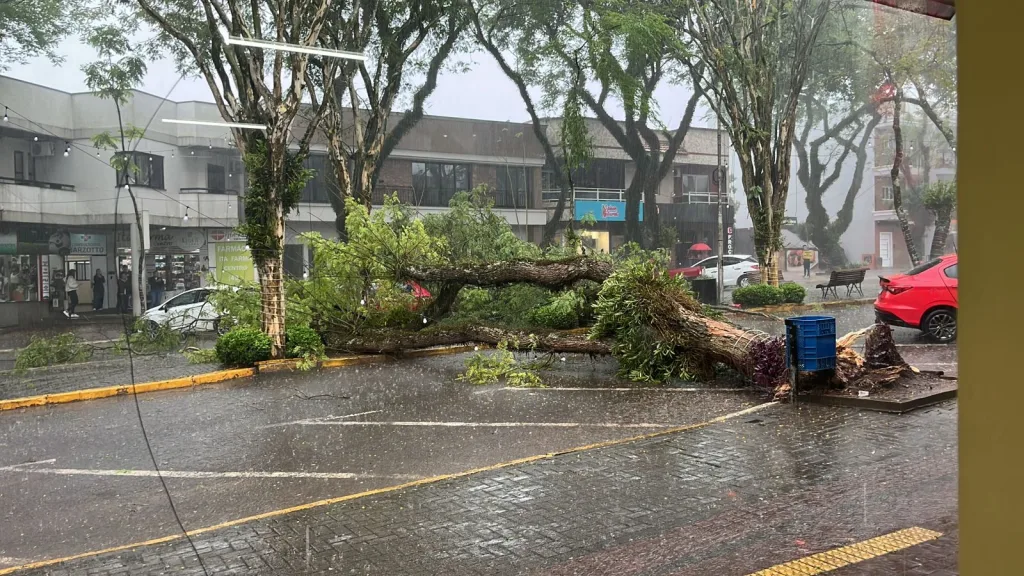 A chuva e os ventos fortes registrados na tarde desta sexta-feira, 07, causaram quedas de árvores a transtorno na cidade de Itá.