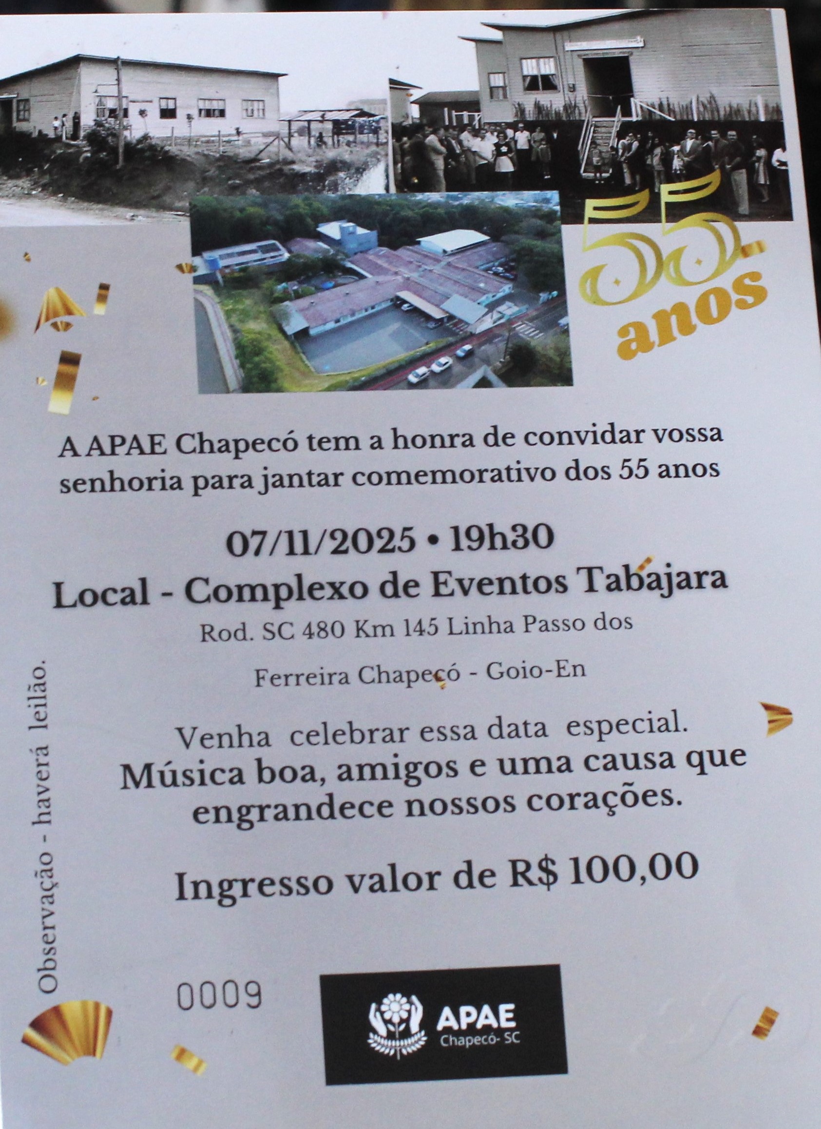 Pelo valor de R$100,00 a unidade, os ingressos para o jantar podem ser comprados diretamente na Apae Chapecó, localizada na Travessa Encantado, 148-E, no Bairro Palmital, ou pelo direct do Instagram da associação – @apae_chapeco – e retirados na noite do jantar.